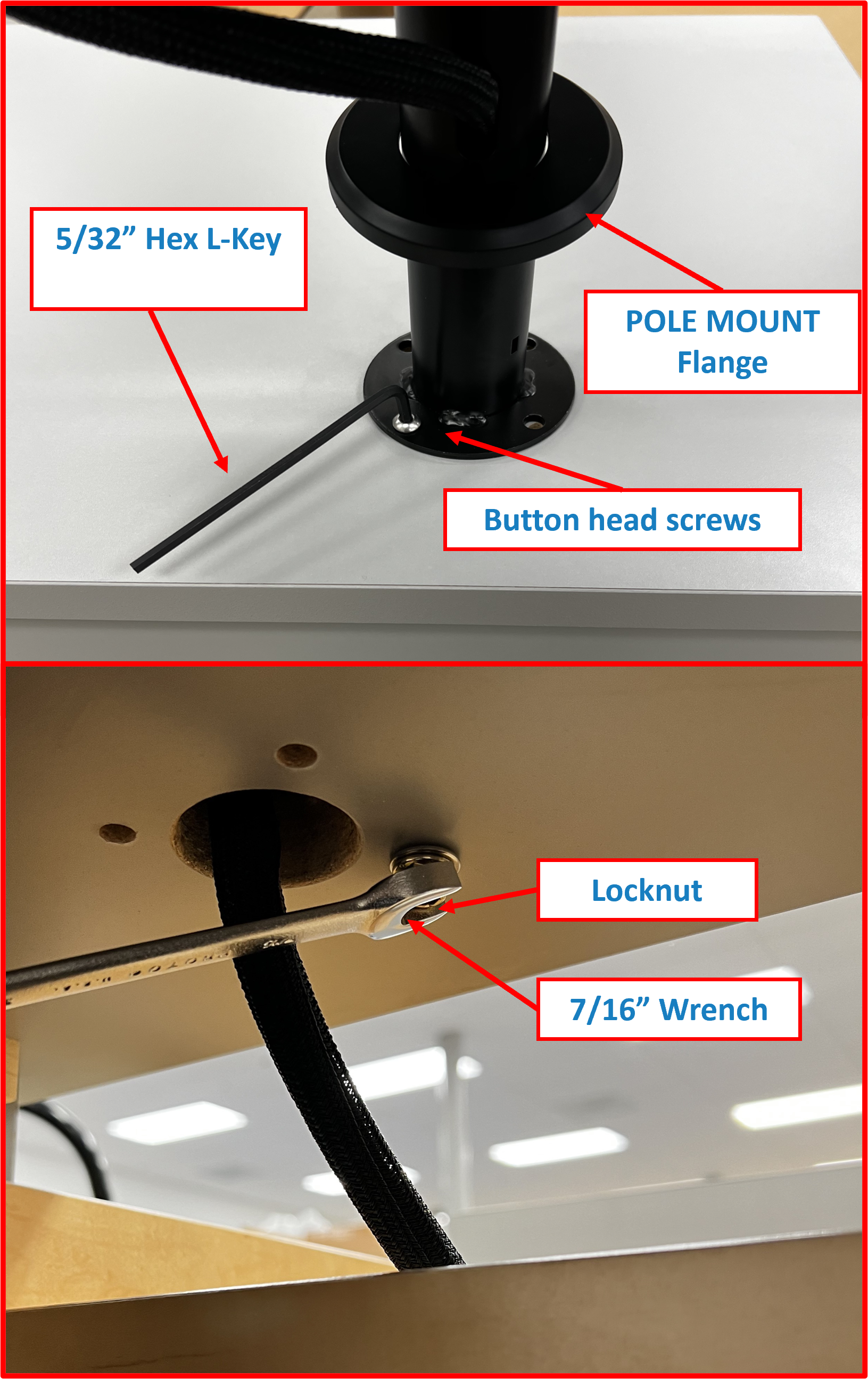 Lift the POLE MOUNT flange as to expose the hex button head screws and engage the 5/32โ Hex L-Key . In addition, using the 7/16โ wrench, engage the locknut. In turn, unscrew the button head screw.